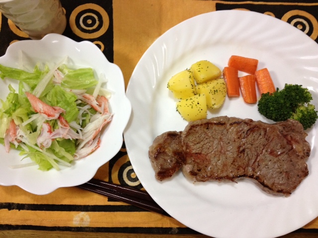 付け合わせはジャガイモ50g(糖質8g)とブロッコリー21g(糖質1g)とニンジン28g(糖質2g)。サラダはダイコン10gとカニかま2本入り。総糖質量約13g。