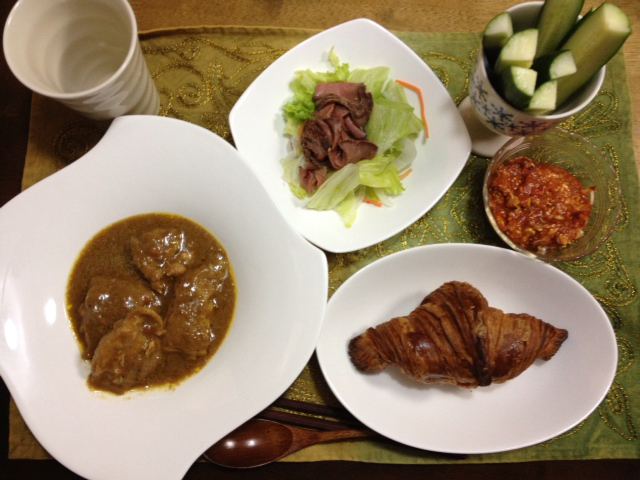市販のチキンマサラカレー(1袋の炭水化物表示31.5÷4皿=1皿分の糖質8g)。ローストビーフのサラダもろきゅう(お手製ニンニクネギ味噌)。クロワッサン(糖質17g)。総糖質量約25g。