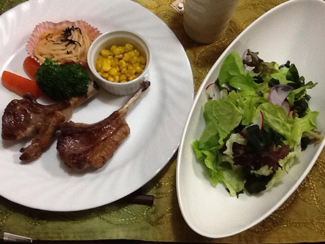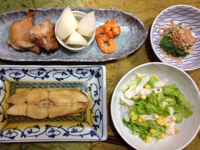 カラスカレイの煮つけと、鶏モモ肉とエビの塩焼。梨(66g/糖質7g)、笹かま1枚(糖質2.5g)とトウモロコシ5g(糖質1g)を入れたサラダホウレン草のおひたし。総糖質量約11g。