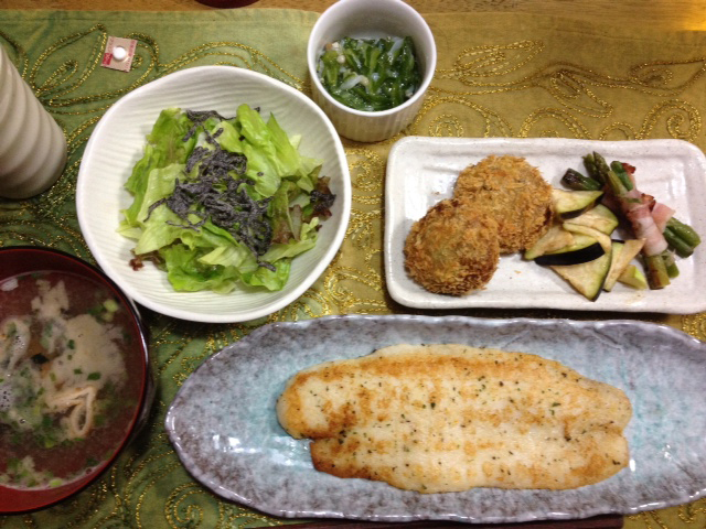 舌平目のムニエルとカレーコロッケ(ジャガイモ40g/糖質7g+タマネギ12g/糖質1g+小麦粉&パン粉/糖質4g)。水ナスの塩もみ、アスパラのベーコン巻き、塩昆布をのせたサラダ、イカオクラ、お味噌汁。総糖質量約12g。