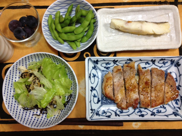 甘塩タラのオリーブオイル焼き、豚肉のソテーの甘辛味、枝豆、塩昆布と塩もみキャベツ(50g/糖質2.5g)とレタスのサラダ。巨峰100g(糖質15.7g)。総糖質量約19g。