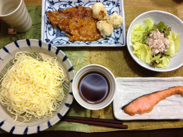甘塩サケ。ツナサラダ(タマネギ/糖質1g)。豚ロース肉の味噌焼き。カリフラワー(34g/糖質2g)。玉子豆腐風そうめん(麺つゆ込み糖質9g)。総糖質量約12g。
