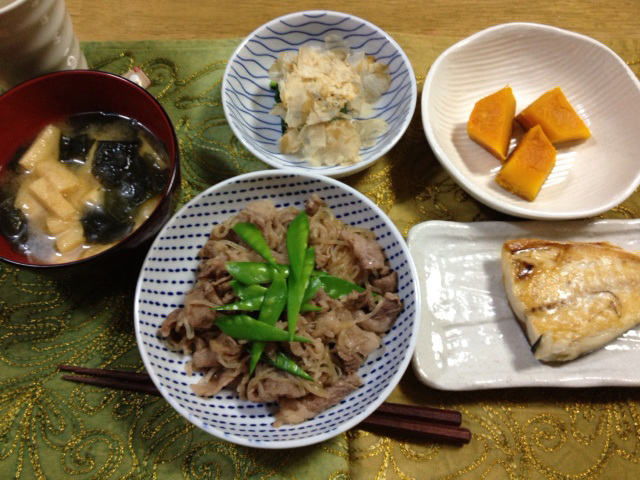 塩サバのオリーブオイル焼き、牛肉としらたきの煮物、ホウレン草のおひたし(30g/糖質1g)。カボチャ(皮なし)の煮つけ(60g/糖質13g)。油揚げとわかめのお味噌汁。総糖質量約14g。