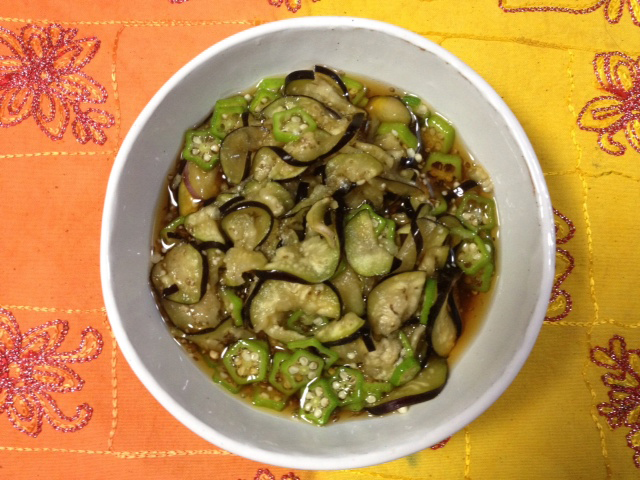 鶏ササミの焼きびたし。ナス1/2本(糖質/2g)、アスパラガス2本(20g/糖質1g)、カボチャ(24g/糖質3g)の揚げびたし。ポキ(タマネギ15g/糖質1g+トマト30g/1g)。玉子豆腐風そうめん(麺つゆ込み/糖質9g)。総糖質量は約17g。